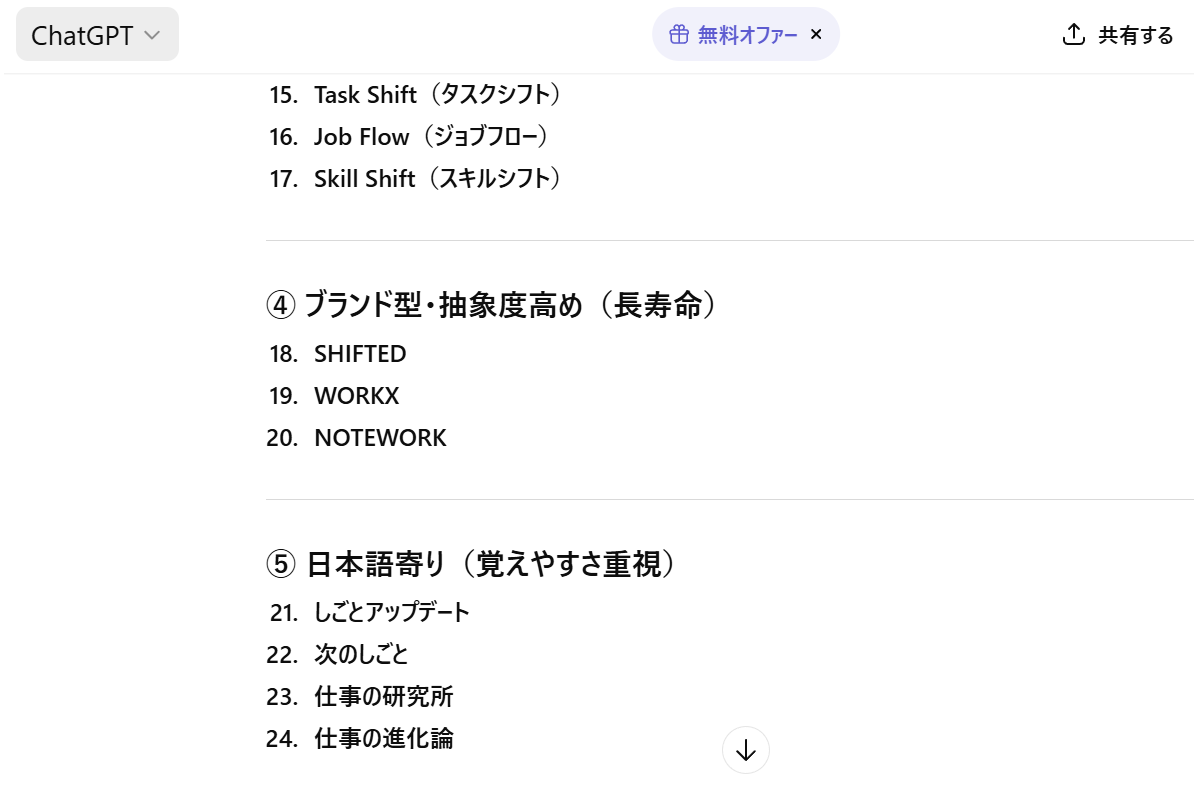 特に、ネーミングや企画初期のアイデア出しでは、人間では思いつかない組み合わせを短時間で量産できるため非常に相性が良いです。(私も会社でプレゼンのタイトル出しなどに活用しています)